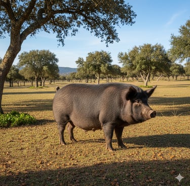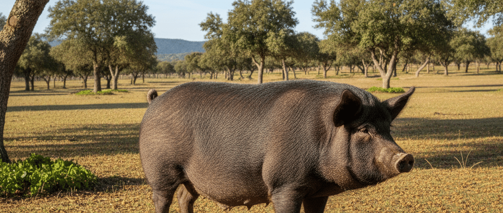 En el corazón del auténtico jamón ibérico se encuentra el cerdo ibérico, a menudo llamado cariñosamente pata negra. No se trata de un cerdo cualquiera; es una raza especial, adaptada de forma única a la Península Ibérica. El jamón de mayor calidad proviene de cerdos ibéricos de pura raza que pasan sus últimos meses de vida deleitándose con bellotas en los vastos y biodiversos bosques de robles de la dehesa. Esta dieta rica en bellotas es fundamental, ya que le confiere su distintivo sabor a nuez y, fundamentalmente, su alto contenido en ácido oleico, la misma grasa saludable presente en el aceite de oliva.
