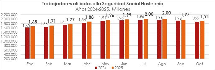 El sector de la hostelería alcanzó en octubre 1,91 millones de trabajadores afiliados a la Seguridad Social, que supone un incremento cercano a 33.000 afiliados respecto al mismo mes del año anterior (+1,7%), según los datos de afiliación del Ministerio de Trabajo. Este ritmo de crecimiento anual mantiene la tendencia de moderación observada en los últimos meses.