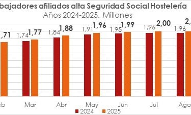 Por ramas de actividad, en restauración el número de afiliados creció un 1,4% interanual por tercer mes consecutivo, hasta alcanzar cerca de 1,48 millones de trabajadores, que supone 20.353 afiliados más que en octubre de 2024. Por su parte, en el alojamiento el aumento fue de un 2,9% (dos décimas por debajo de la tasa anual de septiembre) con un total de 436.385 trabajadores, que representa 12.475 más que en el mismo mes del año anterior.